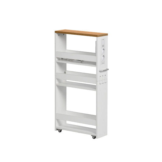 Chariot de rangement étroit blanc à 4 niveaux avec multiprise et roulettes – GOODE Organiseur de cuisine et de salle de bain