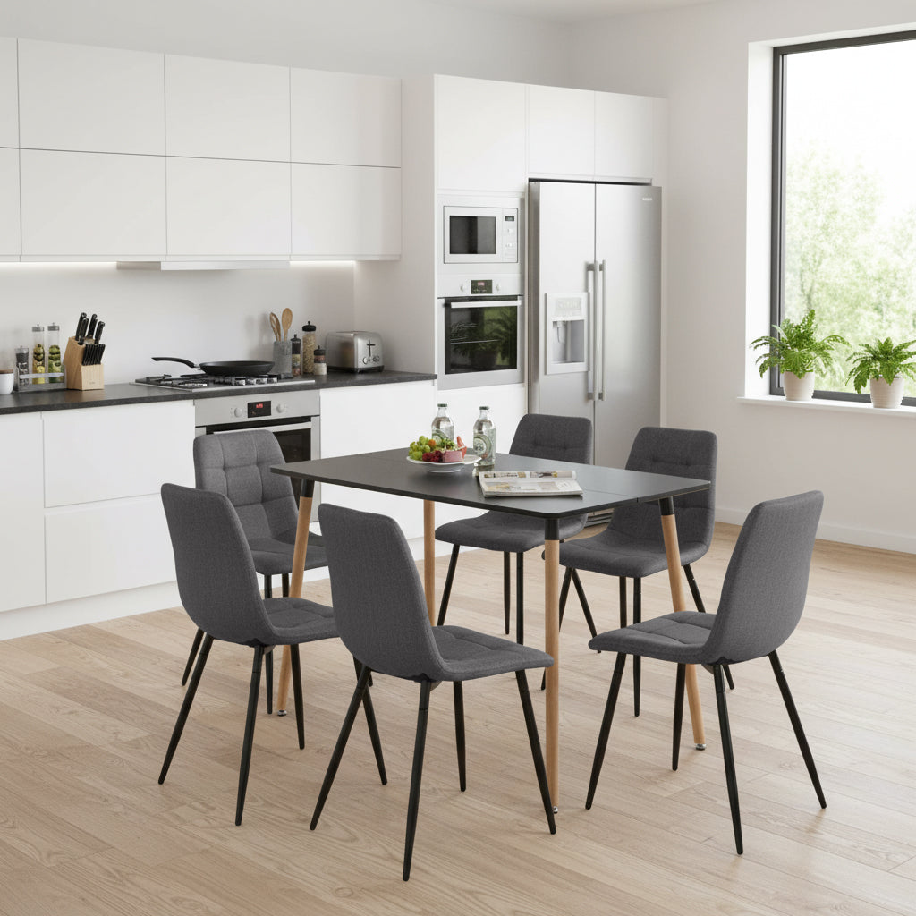 Cette chaise de salle à manger en tissu apportera une touche d'élégance à votre espace, alliant à la perfection luxe et confort. Choisissez parmi un velours noir classique haut de gamme, du lin gris ou du cuir marron, tous confectionnés avec un toucher doux et soyeux et une construction robuste et durable. Un rembourrage en mousse haute densité assure un soutien confortable. L'élégante structure de l'assise s'harmonise avec les pieds en fer noir, créant un style moderne et sophistiqué qui s'intègre facilement à tous les intérieurs.